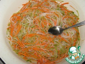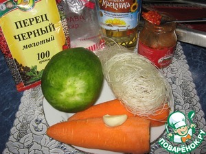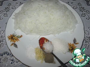 Отварить фунчозу пару минут, откинуть на сито. Подготовить специи, натереть на мелкой терке чеснок.