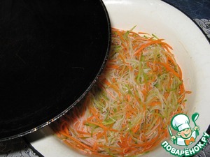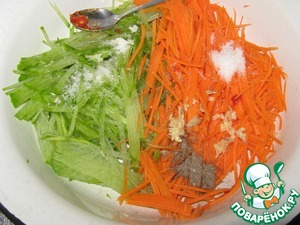 На корейской терке натереть морковь и редьку. Добавить все специи, сахар, соль. (перец у меня красный жгучий, перемолотый, его можно заменить на молотый красный)