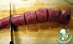 Нарезаем вырезку крупными кусками по 4–5 см.