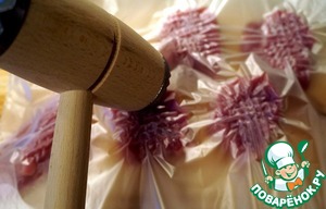 Ставим кусочки вертикально и немного отбиваем с каждой стороны. Я использую пакет, чтобы сохранить кухню в чистоте.