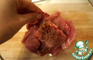 Кладем мясо в миску, добавляем оливковое масло, соевый соус, винный уксус и перец. Оставляем мариноваться на 30 минут.
