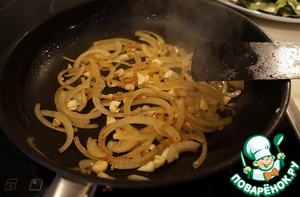 Пока мясо маринуется, обжариваем лук и чеснок на оливковом масле до золотистого цвета.