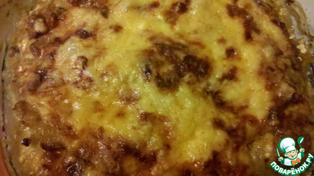 Выкладываем мясо в форму, сверху добавляем лук и чеснок, затем тертый сыр и, наконец, майонез.