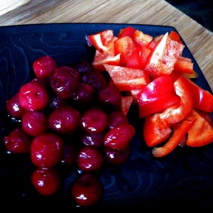 Болгарский перец нарезать. Если вишня замороженная, разморозить.