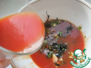 Соединяем специи, соль, сахар ТМ "Мистраль" и оливковое масло, соевый соус, заливаем всё томатным соком