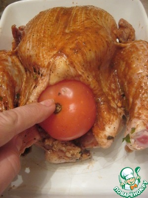 прекрасно смягчает мясо снаружи и изнутри (помидор прекрасно питает курицу во время запекания)