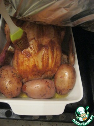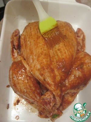 Через час поднять фольгу, смазать курицу маринадом, ещё прикрыть на полчаса. Потом открыть от фольги полностью, и ещё дважды промазываем маринадом с интервалом около 15 минут.