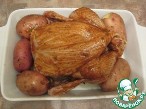Это гарнир - всегда, когда я готовлю большую и сочную курицу, я кладу к ней картофель, чтобы он пропитался и напитался соком и ароматом. В этот раз я нафаршировала его дольками чеснока
