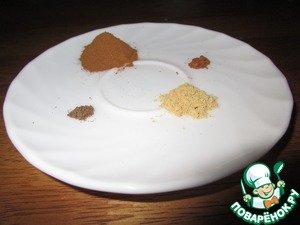 Специи: корица - 1 чайная ложка, порошок имбиря - 1/4 ч. л, щепотка мускатного ореха, щепотка душистого перца.