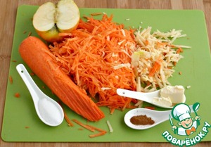 В это время готовим начинку. Морковь и яблоко очистить, натереть на крупной терке, яблоко можно слегка отжать