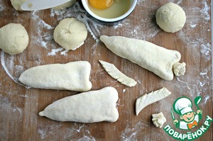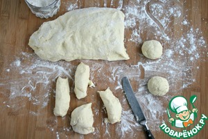 Подошедшее тесто разделать на кусочки 45-50 грамм. Немного теста оставить для "хвостиков"