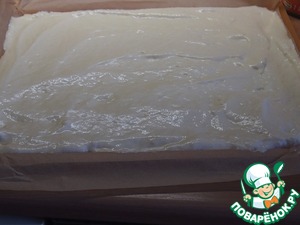 Застелить противень бумагой для выпечки, вылить тесто, разровнять и печь в разогретой духовке при температуре 180 градусов 10 минут. Размеры моего противня 30Х40 см.