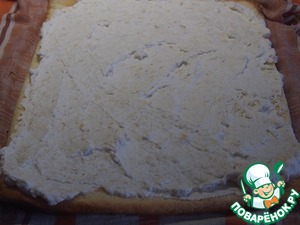 Рулет развернуть, с помощью кисточки немного смочить яблочным соком, сверху нанести крем и свергуть рулет. -