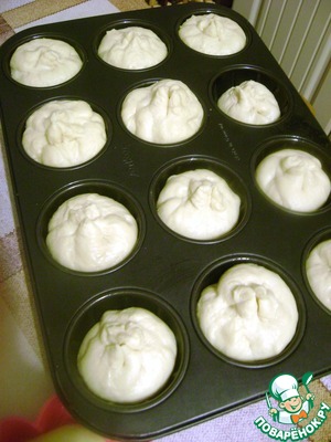 • Собрать края и скрутить немного узелочком. Уложить в формочки для кексов, можно и просто на лист, но тогда булочки будут плоскими-тесто мягкое и будет расплываться. Ножницами сделать на булочках небольшие надрезы, чтобы крем пропекся и не отмочил изнутри булочку.