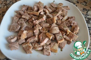 4. Мясо посолить, поперчить и посыпать рубленными листьями розмарина. Обжарить в небольшом количестве оливкового масла по 2 минуты с каждой стороны и нарезать крупными кусочками.