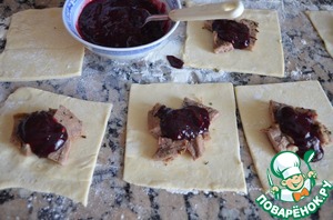 5. Слоёное тесто нарезать квадратами, поверх выложить по нескольку кусочков мяса и полную чайную ложку малинового соуса.