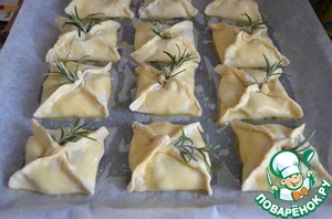 Верх намазать взбитым яйцом и воткнуть в каждый пирожок по маленькой веточке розмарина.