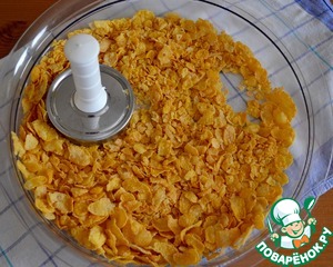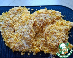 Итак, куриную грудку нарезать в виде отбивных и слегка отбить. Кукурузные хлопья растолочь, можно положить в пакет и побить молоточком...