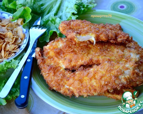 Предлагаю вам свой любимый вариант приготовления куриных отбивных... Надо сказать, что необычная, вкусная, хрустящая корочка на этих отбивных делает их очень привлекательными для детей! Но, поверьте, не только они будут в восторге от этих отбивных... Важно использовать несладкие кукурузные хлопья! И еще, в этом рецепте рекомендуется использовать такую специю, как сушёные луковые хлопья (которые добавляются к кукурузной крошке). Она придаёт оригинальный богатый вкус отбивным, но если Вам не удастся её найти, просто исключите её из ингредиентов. Ну, а если Вам захочется оставаться в более традиционных рамках приготовления этих отбивных, предлагаю заменить панировку из хлопьев на смесь панировочных сухарей и мелкой кукурузной муки — получается тоже очень вкусно!