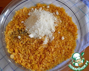 Насыпать измельчённые кукурузные хлопья в широкую миску и добавить к ним натёртый на мелкой терке сыр и луковые хлопья. Как следует перемешать эту сухую смесь.