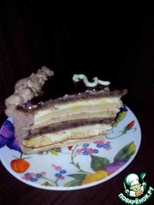 Четвёртый корж - кофейный, далее лимонный и шоколадный. На последний шоколадный корж крем не кладем, а сразу поливаем глазурью. И убираем в холодильник на 15-20 минут.