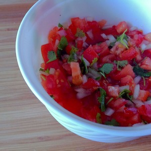 • Для сальсы нарежьте мелкими кубиками помидоры и лук. Добавьте измельчённую кинзу, сок и цедру половинки лайма. Посолите и поперчите по вкусу.