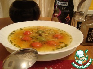 • Выкладываем в суп перец, укроп и петрушку сушённые, лавровый лист, чеснок, масло оливковое и оливки вместе с жидкостью. Варим ещё минут 5 и снимаем с огня.