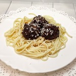 Теперь соберем блюдо. На тарелку выложите спагетти и полейте их ягодным соусом. Сверху выложите "фрикадельки" и добавьте еще немного соуса. Имитацию пармезана создайте с помощью тертого белого шоколада.