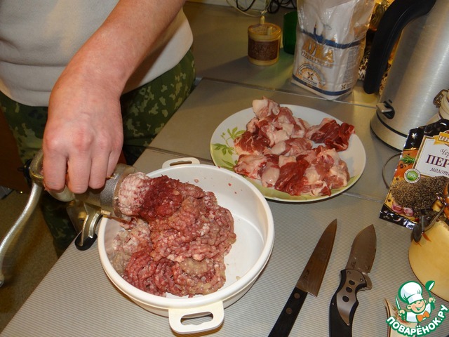 И крутим на мясорубке. В оригинале конечно ни о какой мясорубке и речи быть не может, всё должно рубиться ножом. Но прогресс, недостаток времени и лень делают своё дело.