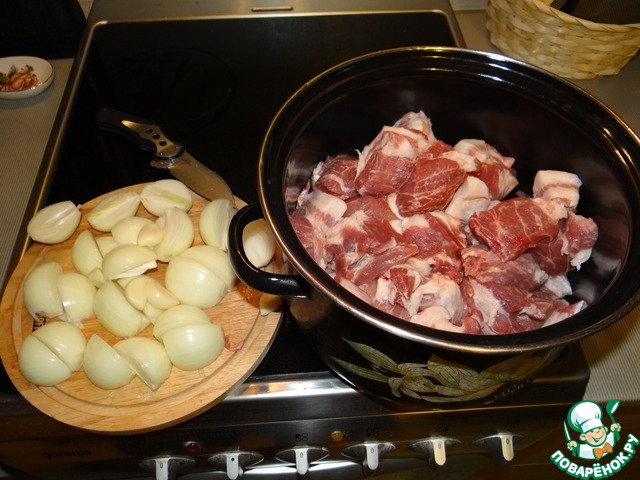Для фарша нам понадобится полтора кг свинины, полкило говядины, лук, чеснок, соль, перец. Мясо желательно использовать пожирнее так как сок в позах имеет немаловажную роль, но об этом позже.