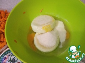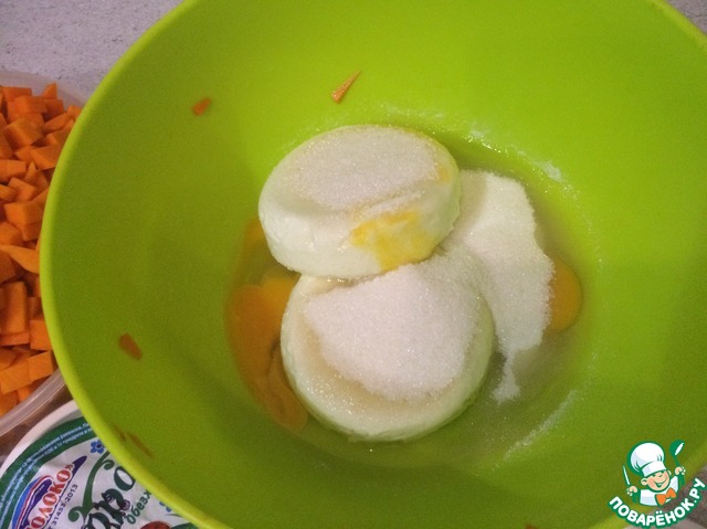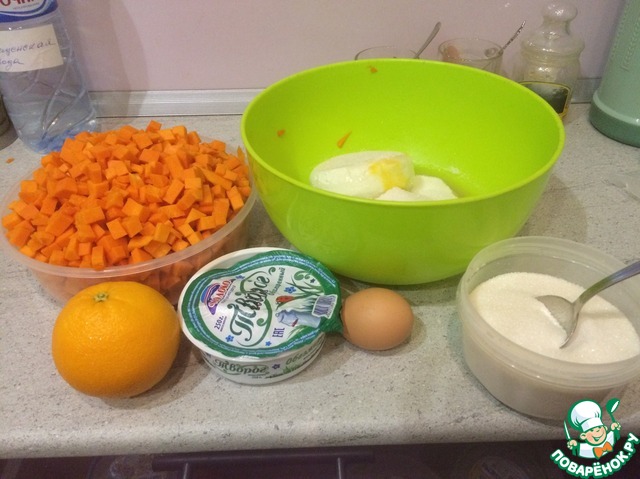 Возьмём тыкву и режим её на кубики ( у меня муж в этом ас), творог, сахар, яйца и апельсин и начнём.