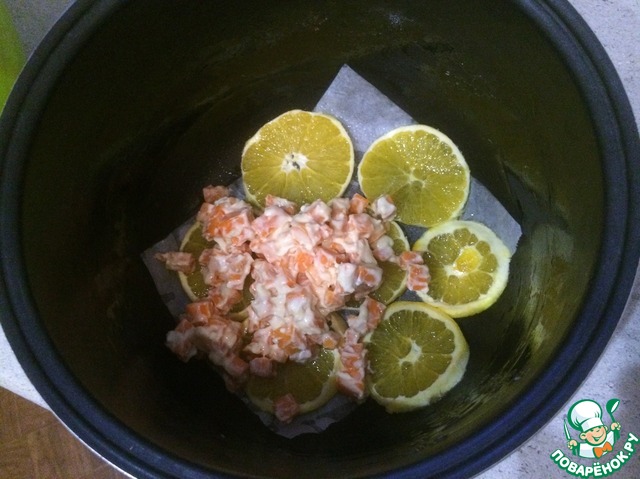 Смазываем дно и края кастрюльки маслом. Что бы хорошо отставала запеканка я приспособилась на дно ложить бумагу для выпечки, небольшой квадрат, только на дно. И на бумагу укладываем кружочки апельсина, и смотрится красиво и очень вкусно.