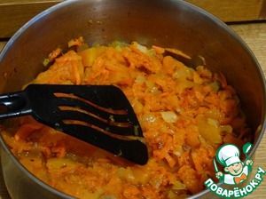 Лук кубиками и морковь мелкой соломкой обжарить до легкого румяного цвета, добавить тыкву, нарезанную пластинами. Тушить под крышкой до мягкости тыквы. Попробовать на соль-сахар. Мне захотелось добавить немного сахара и сок лимона.