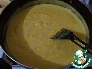 Затем вливаем сливки, смешанные с бульоном, солим, тщательно размешиваем, прогреваем 5 минут, затем добавляем остальные специи и доводим до готовности наш соус в течение еще 5 минут на очень маленьком огне.