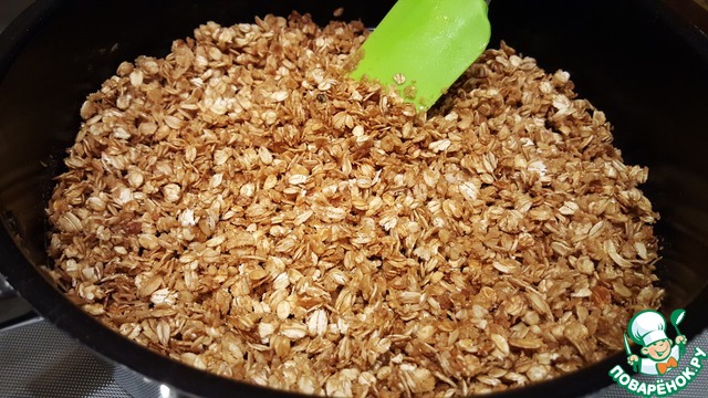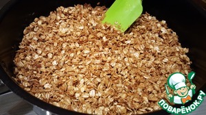 Разогреть сковороду. Насыпать в неё 5 ст. л. сахара. Когда сахар начнёт плавиться добавить овсяные хлопья. Хорошо помешивая на среднем огне карамелизировать хлопья. Выключить.