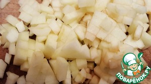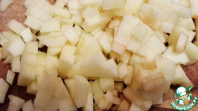 Очистить зелёное яблоко от кожуры, удалить сердцевинку и нарезать на мелкие кубики. Включить духовку 180*.
