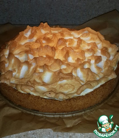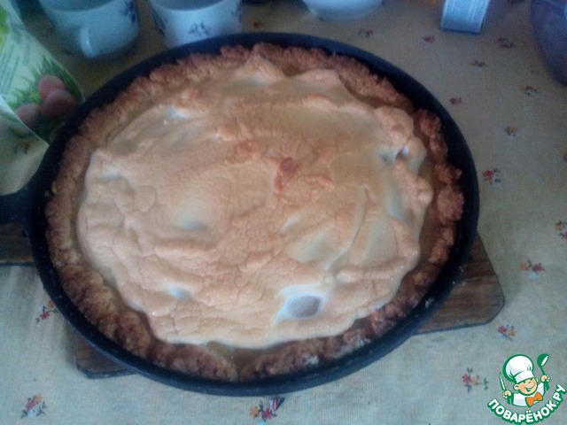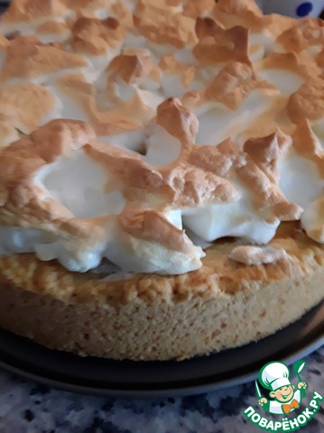 Вытащить пирог из духовки, распределить ложкой сверху белки и отправить на 5 минут пирог опять в духовку.