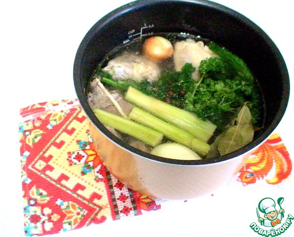 На следующий день, хорошо промыть говядину, куриные бедрышки. Выложить мясо в чашу мультиварки, залить 3 литрами воды ( больше воду не подливать) выставить режим « Суп» на 2 часа. Снять накипь, добавить очищенную морковь, репчатый лук, разрезанный пополам, обжаренный, на срезе, на сухой сковороде. Такой обжаренный лук придаст супу красивый цвет, аромат, и букет гарнии.