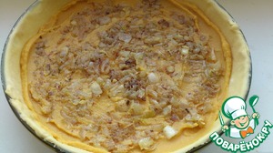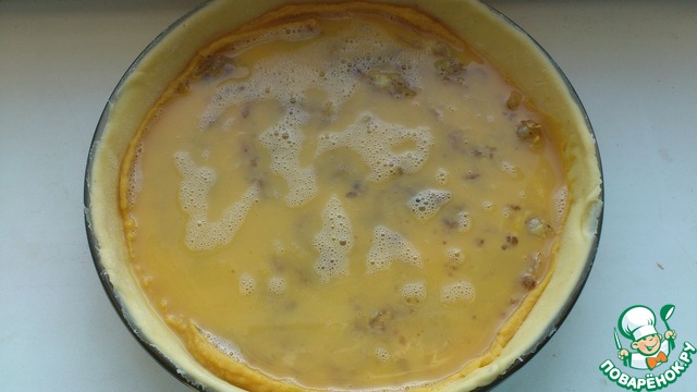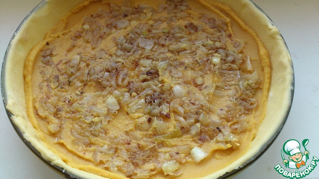 • Тесто раскатать, выложить в форму для запекания. Замечательно подойдет стеклянная форма, ее можно не смазывать - тесто содержит масло и легко выскользнет из нее. Сверху вылить пюре из чечевицы, на него равномерно разложить жареный лук и залить яйцами.