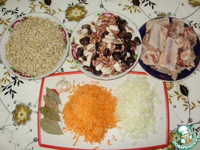 Ингридиенты ждут начала приготовления. Фасоль и перловая крупа после замачивания (пропорция должна быть 1:1) Лук нарезан кубиками, а морковь натёртая на тёрку. Мясо (рёбра) промыты и подсушены.