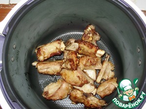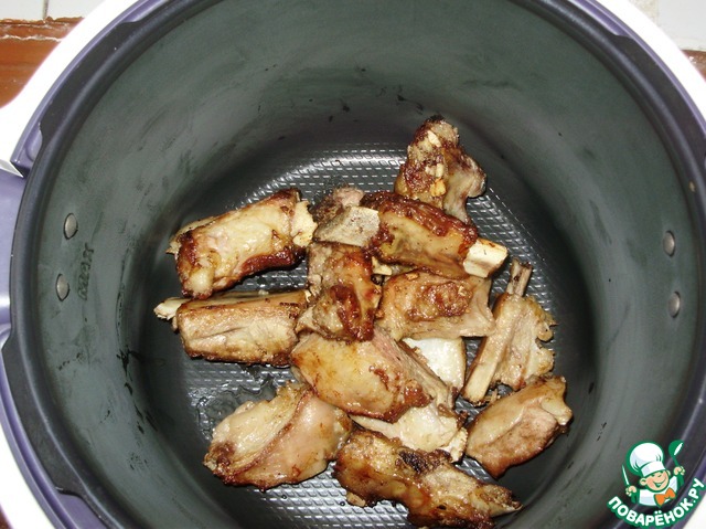 Включаем функцию поджаривания на мультиварке. Обжарить мясо (рёбра) на жиру (масле) до образования корочки.
