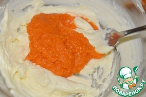 5. Для печенья в чашку выложить мягкое масло и сахарную пудру и взбить в пышную массу. Затем добавить тыквенное пюре, взбить еще раз.