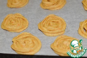 8. Противень застелить пергаментом, отсадить с помощью кондитерского мешка с насадкой печенье. Духовку разогреть до 160 С. Выпечь печенье примерно 15 минут.