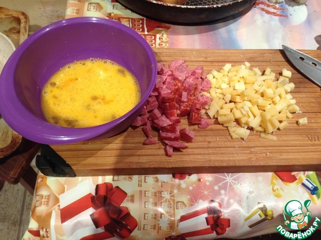 Подготовим ингредиенты - порежем кубиками колбаску, сыр, яйцо взобьём вилкой до однородности. Начинка может быть по вашему вкусу и желанию.