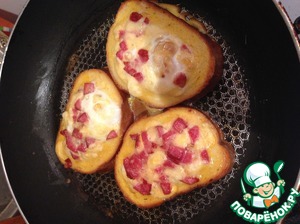 Выкладываем в середину нашего бутерброда начинку и заливаем не большим количеством яичной смеси. Вторым взбитым яйцом с помощью кисточки смазываем края хлебушка, что б получились хрустящие