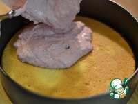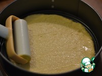 Форму, в которой мы пекли коржи, немножко смазать маслом. На дно формы даем первый корж, выкладываем ягодную начинку. |