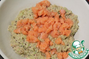 Остальной лосось порезать мелким кубиком и добавить в фарш, перемешать