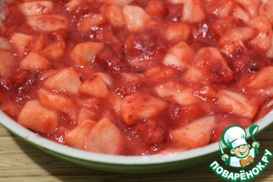 Яблоки очищаем, нарезаем кубиком и вместе с ягодами засыпаем сахаром по вкусу, ставим на огонь, немного тушим.
