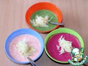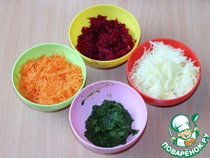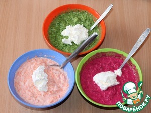 3. Делим тесто на 3 части и смешиваем с овощами (морковь, свекла) и шпинатом. В каждую миску кладем по 1/3 части тертого яблока, перемешиваем.