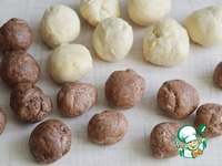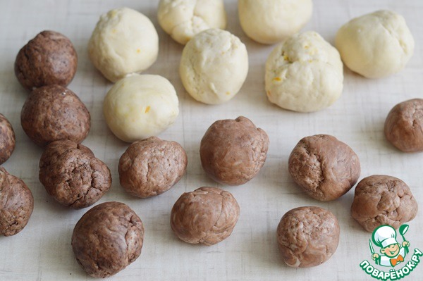 6. Вторую часть разделить на две равные части. 15 г какао смешать с молоком и вмешать в одну часть. 5 г какао смешать с молоком и вмешать во вторую часть. Должно получиться 3 куска разноцветного теста.